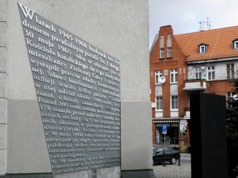 30 maja 1960 r. ok. 5.000 mieszkańców Zielonej Góry i okolicy wystąpiło przeciw komunistycznej władzy w obronie prawa Kościoła katolickiego do domu parafialnego. Byli ranni. Aresztowano ponad 200 osób, a wyroki sięgały do 5 lat więzienia. |